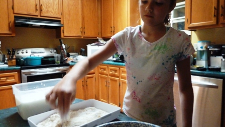 The chicken fries up beautifully with lots of golden-crusty-floured-buttermilk coating sticking to the edges. Lizzy leans back a little when the grease pops. One piece sticks to the bottom of the pan, which Lizzy carefully nudges off the bottom with a spatula, keeping her distance and using mitts as appropriate.