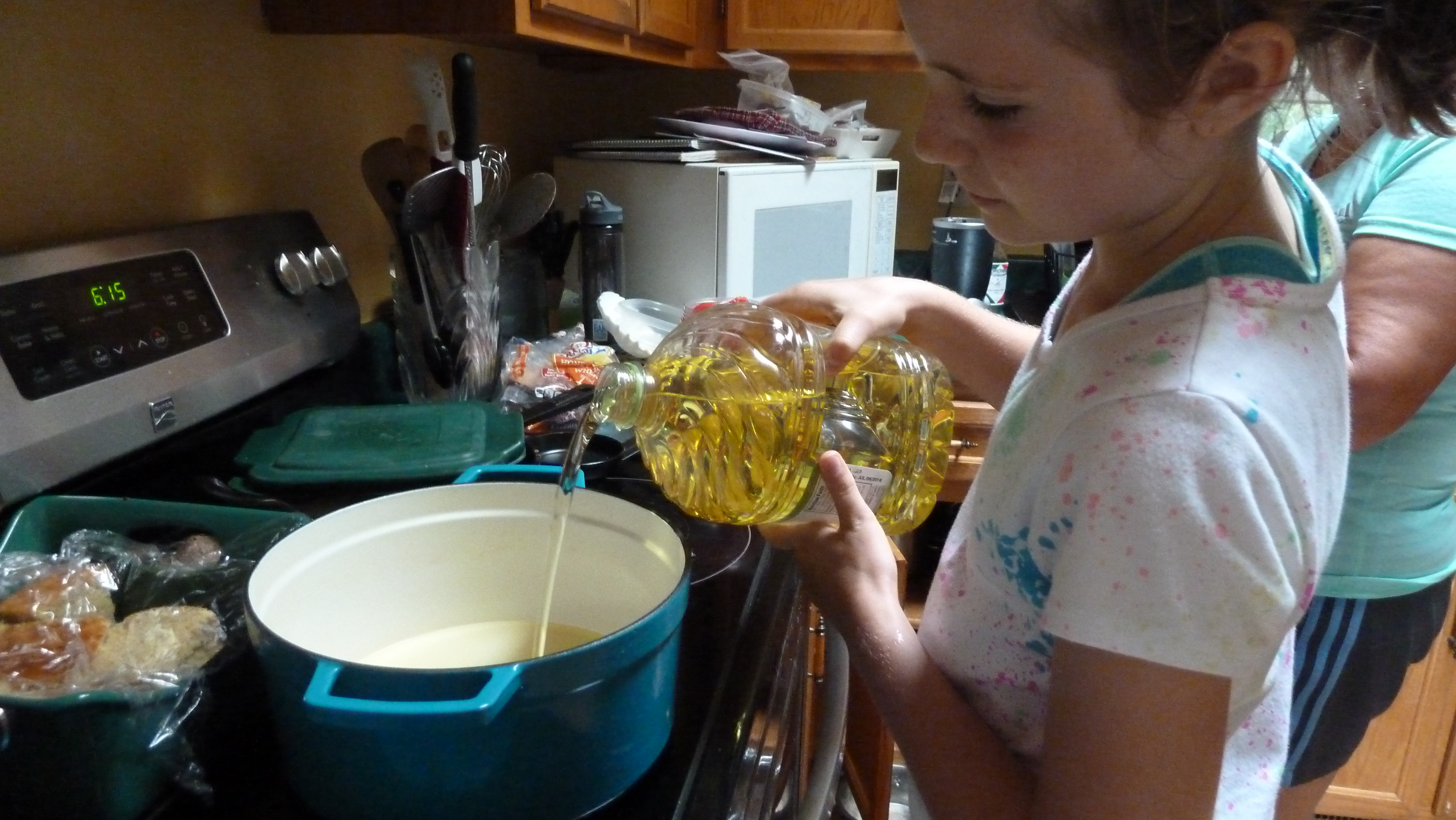 She chugs half a jug of vegetable oil into her Dutch oven-turned fryer. Wow. My daughters never even attempted frying chicken until they were well into their 20s. They too prefer baking or light sauteing of meats, but I think I was scared to let them try the big fry.