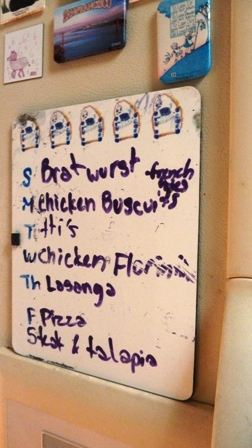She shrugs, not sure. “I’ll decide during the day.” Once school resumes, they’ll begin again their weekly menu planning.