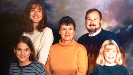 Our daughters at about the ages when I could rely on them to put dinner on the table when I went away. L to R: Tanya, Michelle, yours truly, Stuart, Doreen.