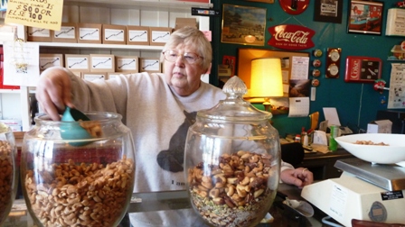 Up front, a glass display case still offers nuts “from all over the world” at decent prices. Containers tempt children with a huge selection of penny candy. An article I wrote at the time of my original visit reminds me that my daughters enjoyed watching a woman make fresh peanut clusters.