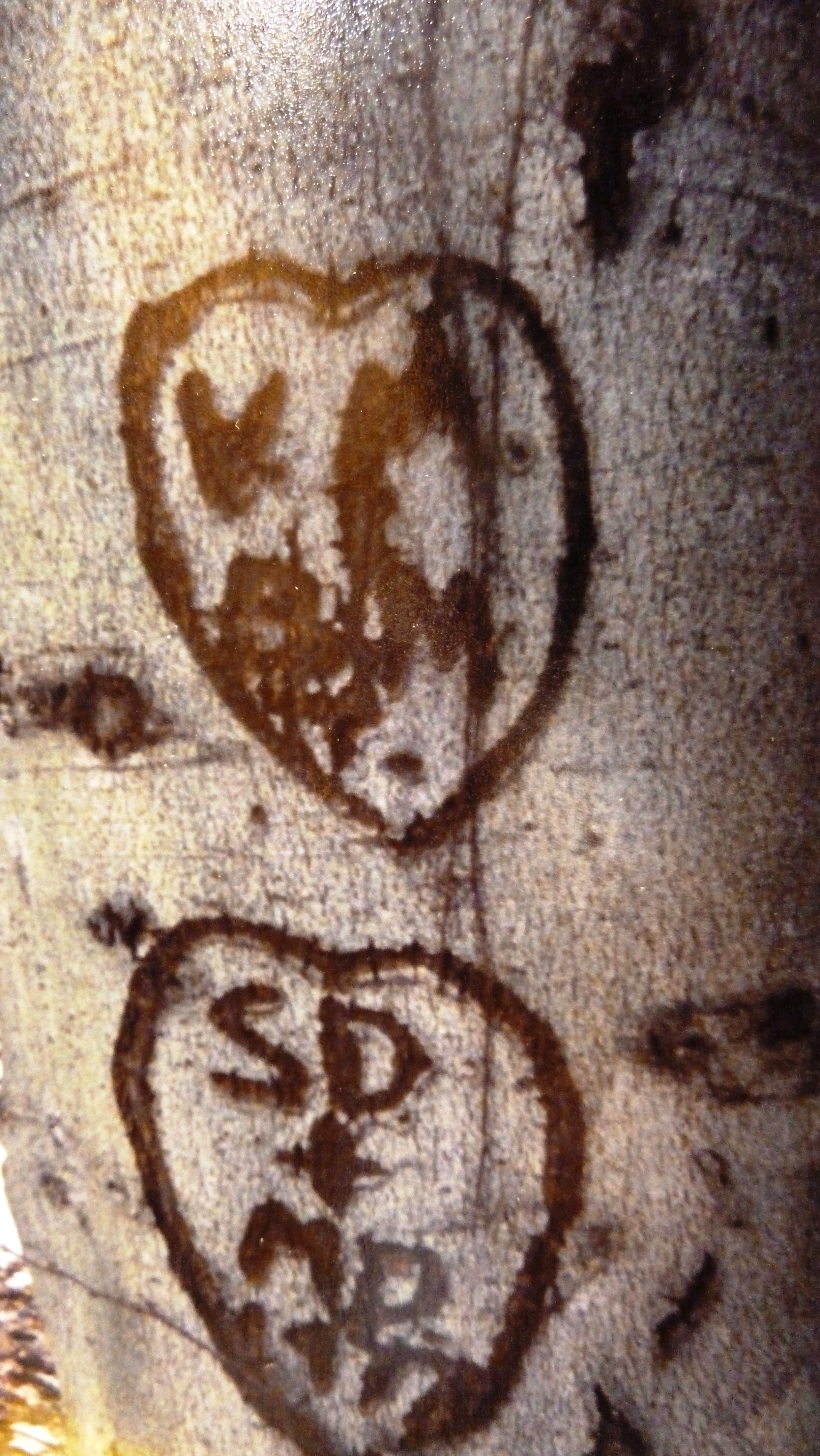 Daddy carved the initials VM + BM in a heart on a tree in the woods on their farm. In 1977, one year after we were married, my husband also carved our own initials on the same tree.