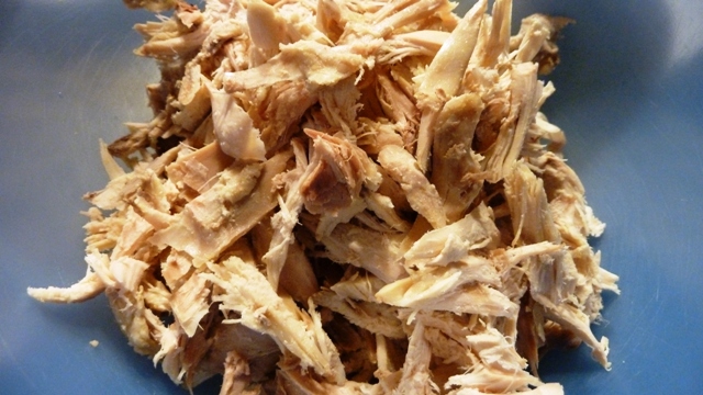 If using breasts, the meat will come apart during further cooking and stirring. Do not pour out broth.