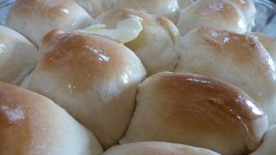 Bake at 350-375 for 15-20 minutes. Watch closely so they don’t get too brown. Remove from oven and immediately spread butter over tops.