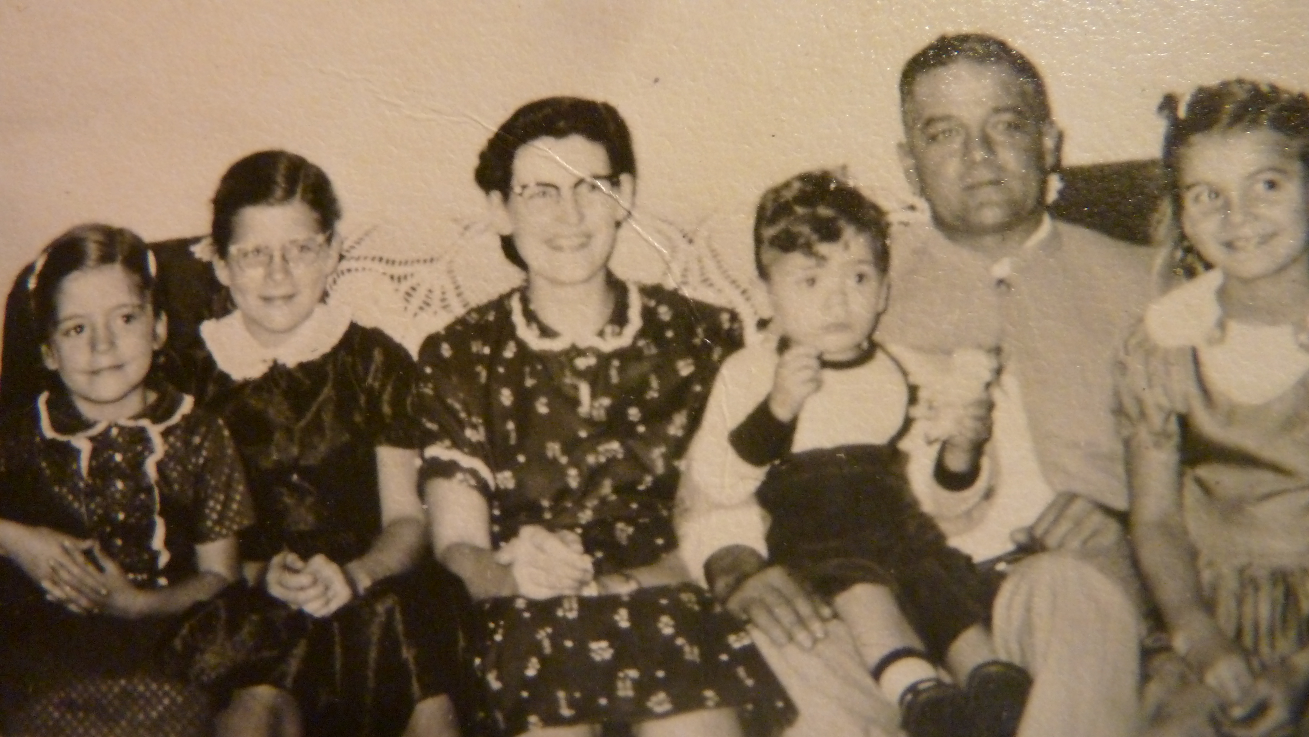 My family circa 1956. Far left: me, oldest sister Nancy, Mother, little bro Terry, Dad, next oldest sister, Linda (Pert).