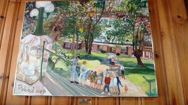 I tracked down Pobai’s paintings at several nearby Presbyterian institutions including this large depiction of Massanetta Springs Conference Center (a synod-owned camp, conference and retreat center that anyone can rent or book for such occasions) that presides over the fireplace in the dining hall there.