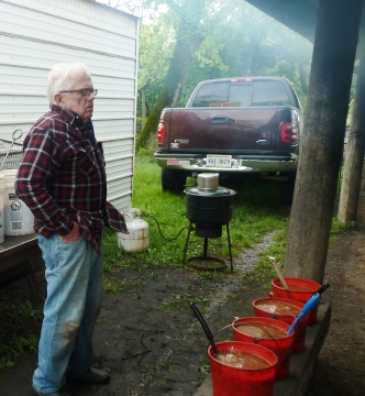 The recipe I will share here comes from another favorite source, my father, who back in the ’50s made barbecue chicken with an oil and vinegar type recipe—no tomato or ketchup or anything red in sight. Daddy loved nothing better than hosting a chicken barbecue at our farm—sometimes back at the cabin—using his half barrel homemade grill loaded with one full rack of chicken—probably about 30 halves, too. He went in full director mode and we kids or friends marched to keep things going: the fresh white work gloves he had to have for handling the chicken; the rack he kept carefully clean; the pot of sauce he stirred and sopped on using a special small “mop;” the squirty bottle to douse flare ups; and most of all the wondrous taste of his chicken fresh off the grill.