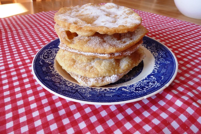 At any rate, I enjoyed making these and sharing them with our neighbors since our kids were not home. If you love pie dough, you’ll love these, because that’s basically what it is: deep fat fried pie dough with sugar on top, very similar to “Elephant Ear” pastries made at lawn parties here in Virginia. I may have not rolled them as thin as I should have, looking at another photo of this delicacy. It reminds me of the little rolled up scraps of dough my mother used from pie baking, adding melted butter and cinnamon sugar and rolling them up for little pie dough cinnamon rolls. This treat is about making memories and keeping family traditions!