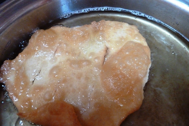 Heat shortening in a large kettle over high heat (or use an electric frying pan with a temperature control.) When the shortening is 365 degrees F, try testing a piece of dough to see if it cooks or sizzles; put the rolled out “Nothing” into the kettle or fry pan (fry one at a time, unless you have a huge kettle). Turn each piece over with two forks or large spatula once it turns golden on the bottom. Remove from oil and place on plate covered with paper towels to drain.