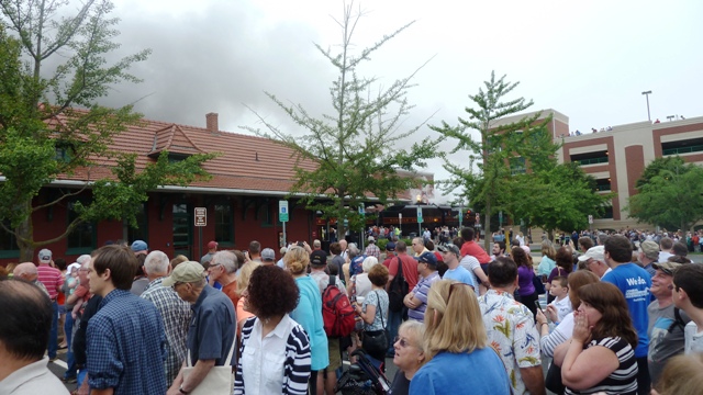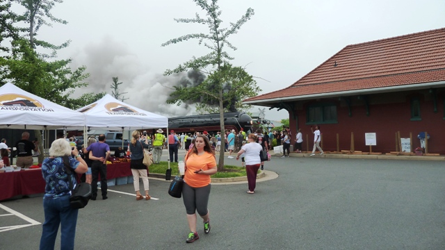 So we got to board a passenger car being pulled by the “611” in Manassas, Virginia where we had to make way for early morning farmer’s market vendors which usually occupy the streets on Saturday mornings. The lines for us to stand in were all well-marked on the street: more than 1000 passengers boarding about 20 cars in a squeeze of time. But that wonderful pre-planning got scrubbed as the vendors made clear who had right of way there: their food and market trucks.
