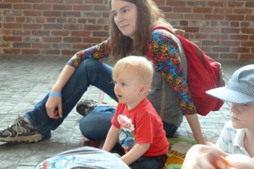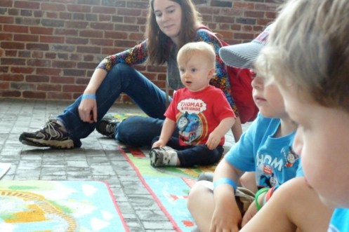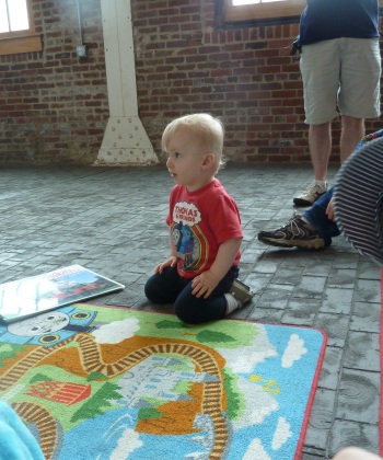 Then I spied a large rug with a handful of children and parents or grandparents sitting cross-legged on the floor in a far corner of the warehouse, which also functioned as an antique train restoration facility. Another energetic woman, this time maybe in her late 40s or early 50s, was reading huge Thomas the Tank Engine books to the small gathered fans. Ah, a chance to sit down, rest, and regroup from the super stimulation of taking in so much fun.