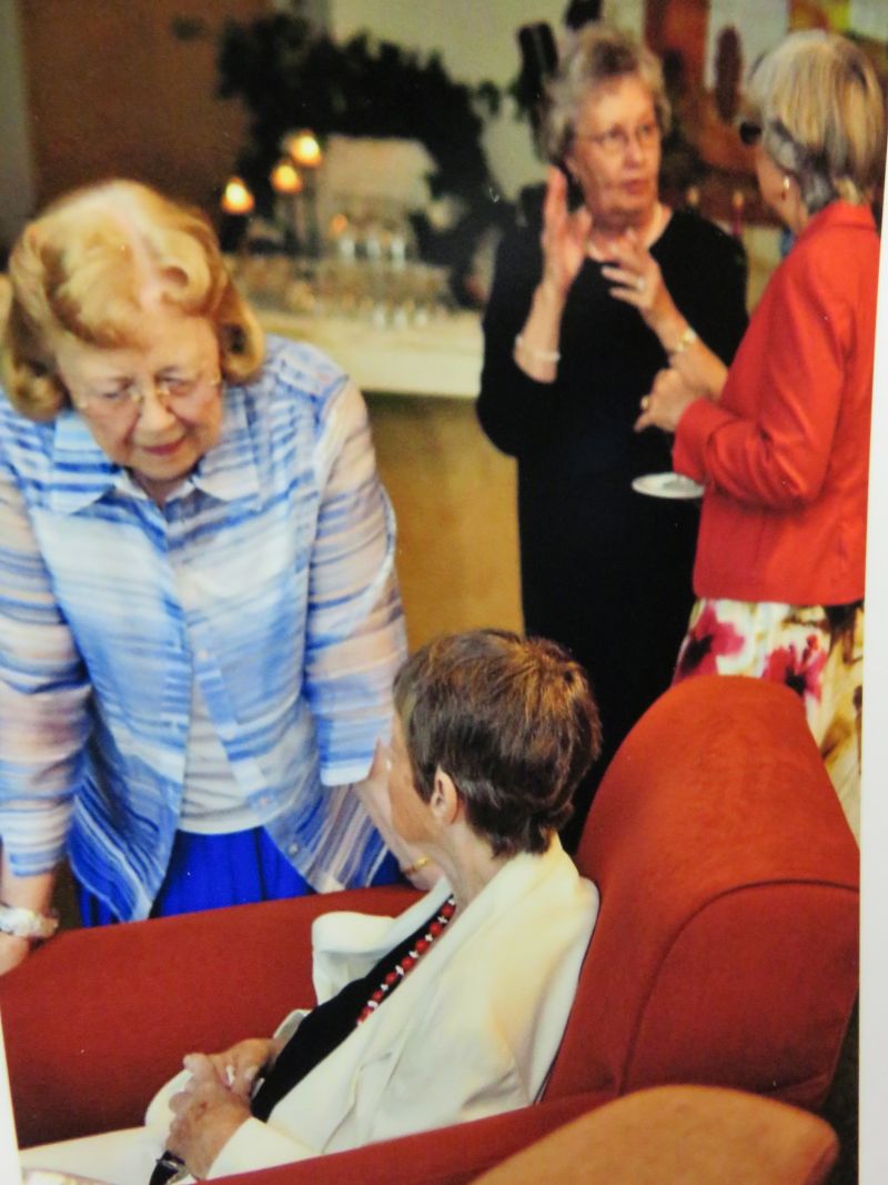 Jackie, seated, chatting with a Trinity friend at the wedding reception.