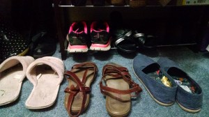 I have more than 3 pairs of shoes, probably more than a dozen, but a modest number by many standards. They include sandals and a new crop of Skecher’s models for injury-prone feet. Until we moved, I held onto a pair of brown suede with gold edging on the stiletto heels that I associated with going fancy and making a break with tradition.