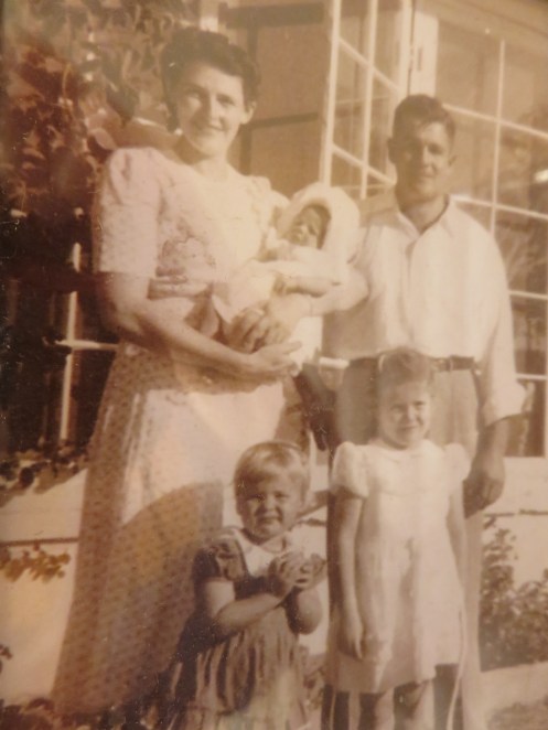 My mother, Bertha, holding me as an infant, probably on a Sunday dressed up for church. My Dad, Vernon plus big sisters Linda (Pert) and Nancy, l to r. My little brother, Terry, was born four years later and lives in north Florida.