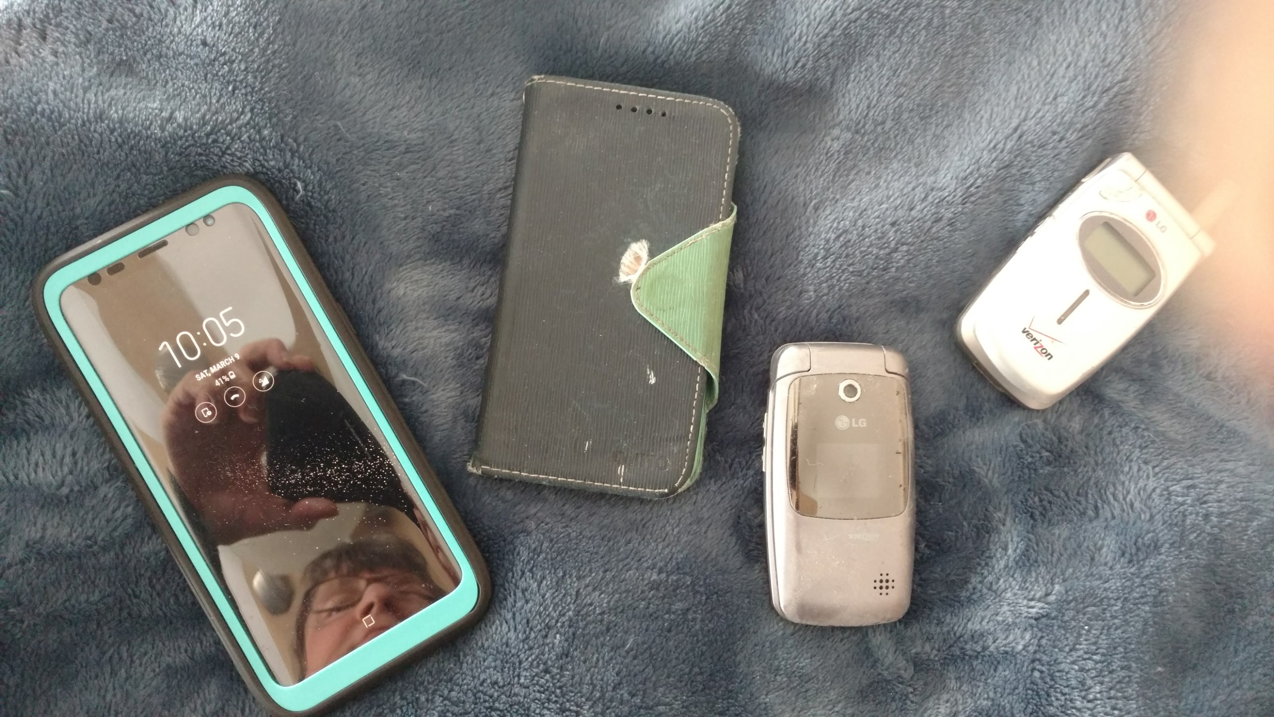 My cell phone history in brief from l to r: Current Samsung Galaxy 8, 2 months old; Motorla X, 2015-2019; LG, 2008-2015; first flip phone, LG, circa 2003-2008. And yes, that’s me snapping the picture reflected in my new phone.
