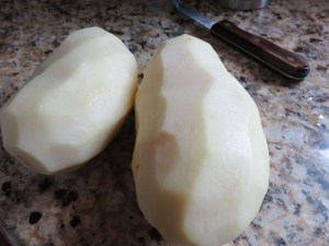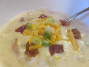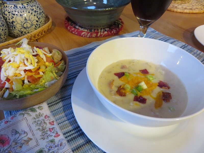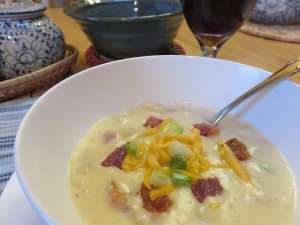 I have experimented for years with trying to duplicate the kinds of yummy loaded potato soup you find in many restaurants and eateries. Basically my efforts were something I made for myself; my family never “got” my attempts: they were not fans. Actually what I grew up on was a very simple farmer’s potato soup. Mom cut up leftover boiled potatoes, added milk, added maybe chopped celery and salt and pepper and we poured that over buttered bread cubes in the bottom of our bowls. We may have had grilled cheese sandwiches with that. A very simple soup and meal but to me it was tasty, warm and filling. We all liked it.