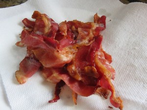 My bacon cooking tip: My standard method of cooking bacon is to spread bacon on parchment paper (learned this from a school cook) on a baking pan such as a cookie sheet with at least a half inch edge. Bake in 400 degree oven for 15-20 minutes. You don’t need to turn the bacon, just bake until your desired degree of doneness is reached.
