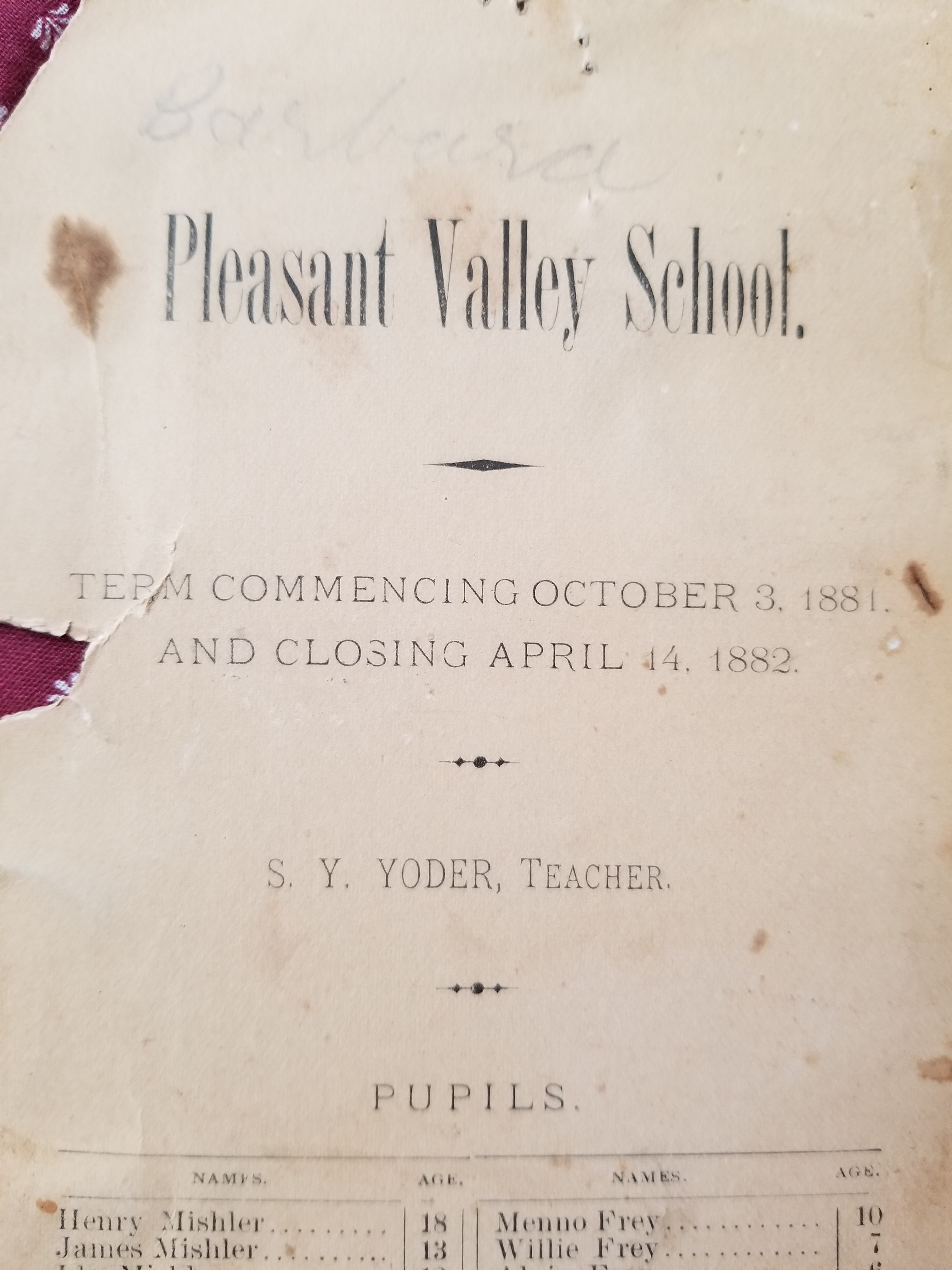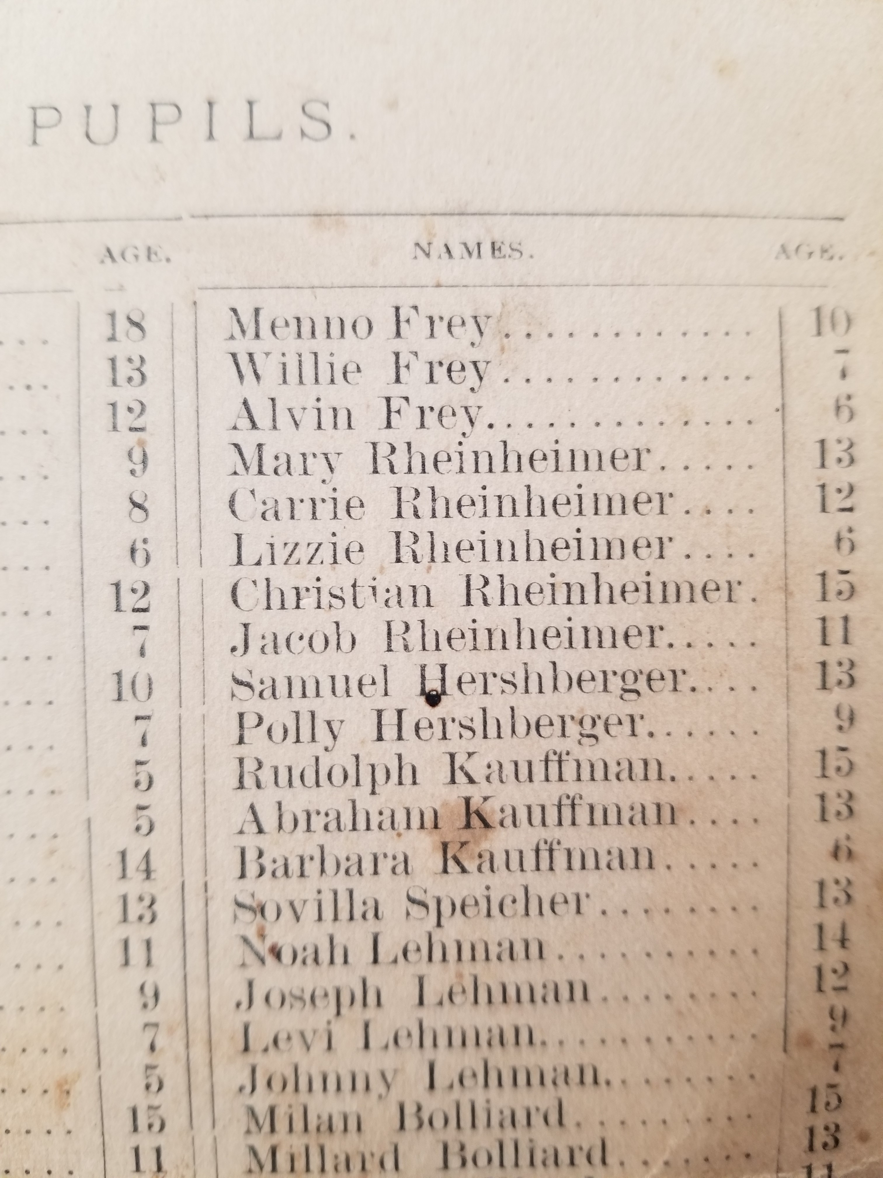 I was looking through your very interesting readings and came across this article! Very interesting! Found my husband Al’s great grandfather Jacob Reinheimer on the school roster!! Also Mary, Carrie, Christian and Lizzie Reinheimer were Jacobs siblings! All there ages are correct according to there birth dates! I have a lot of information on our families history! Love your writings!!! A former classmate .
