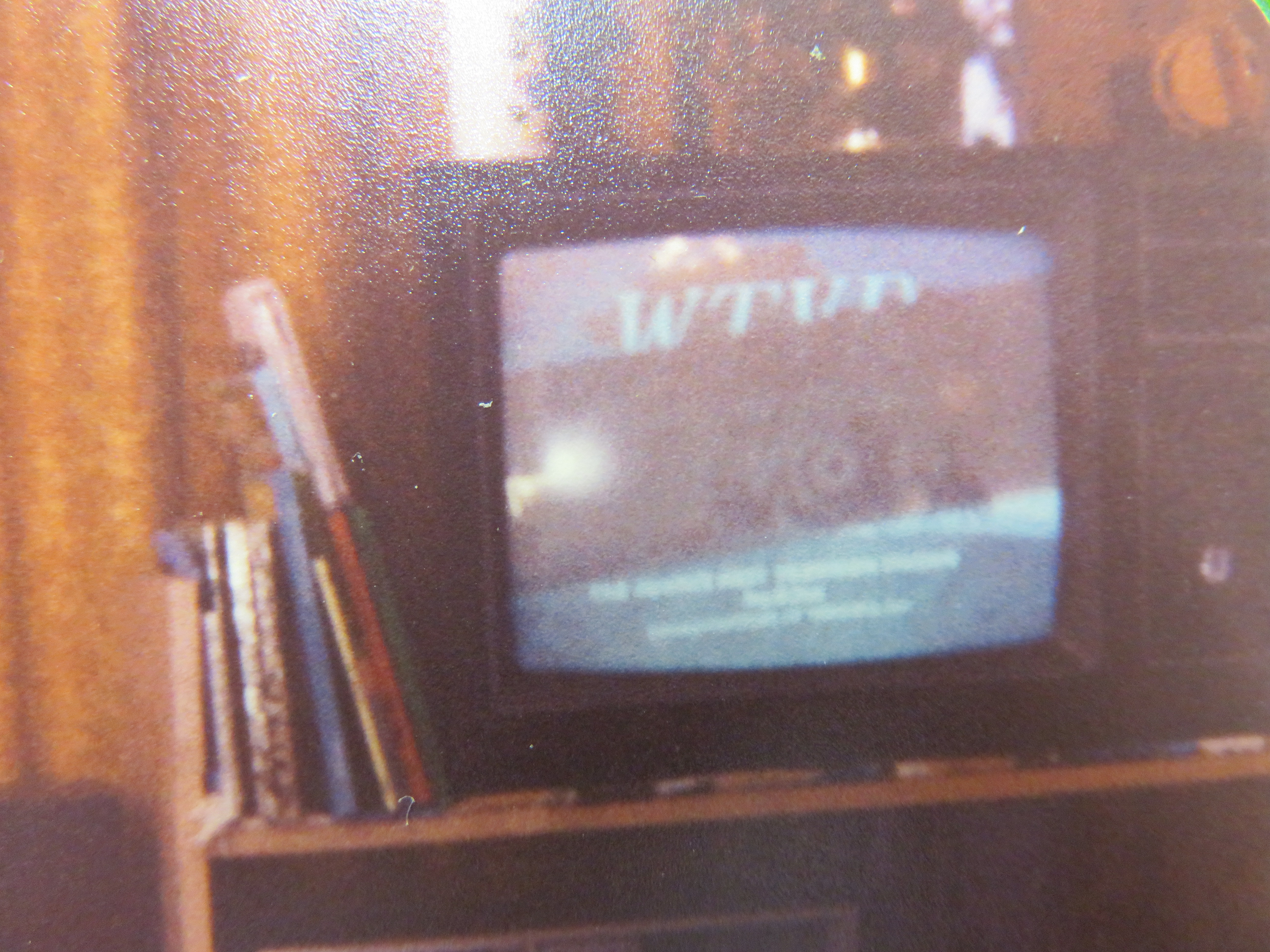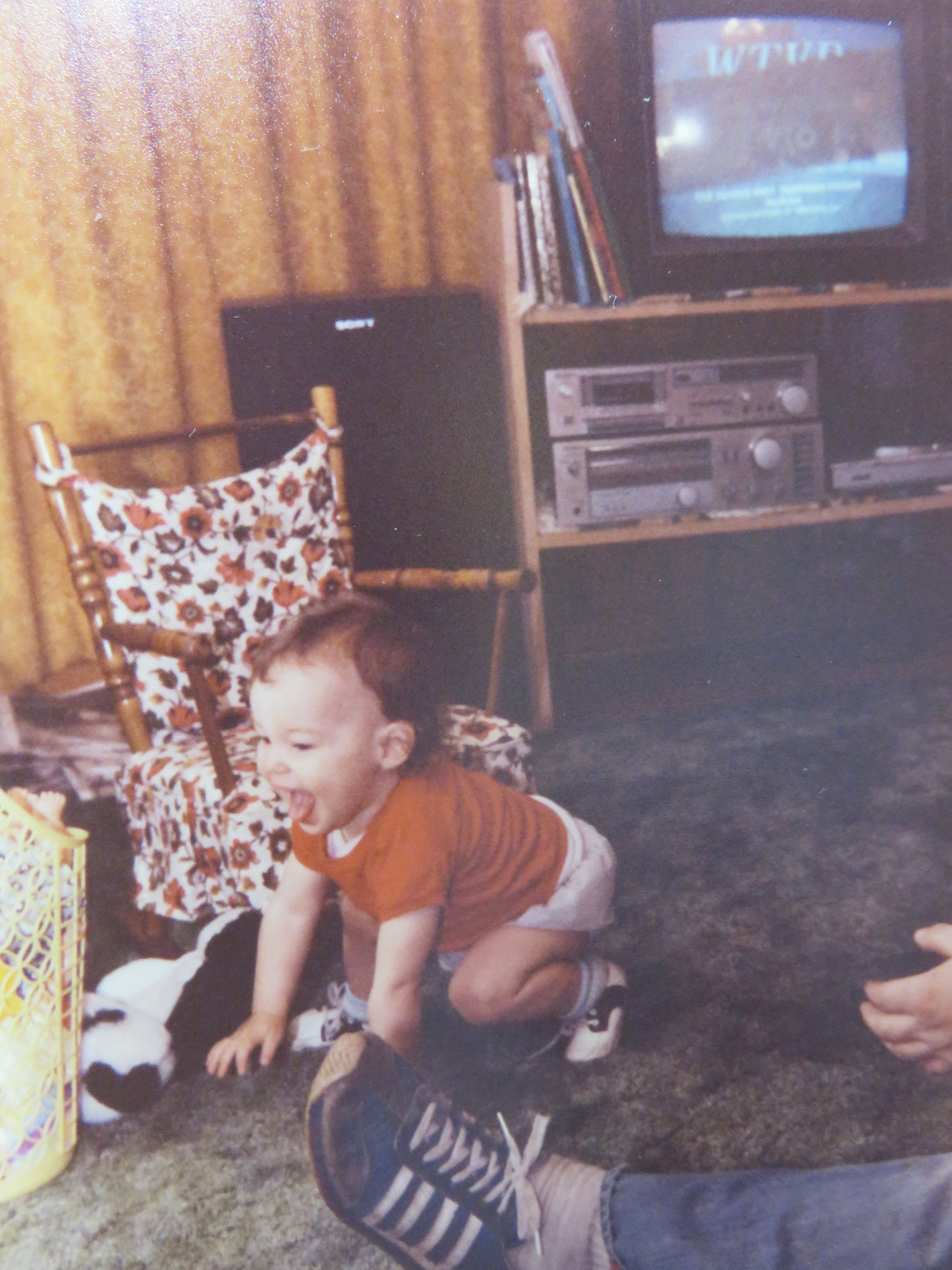 Here you see why I even have an old grainy picture of a grainy TV screen: our oldest daughter Michelle taking some of her first steps. Now that’s JOY, for child and parents alike. Her Daddy is sitting by, ready to catch her if she tumbles.