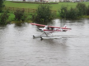 A bush pilot illustrating landing on a river: a necessity for getting around in Alaska for those who live in certain areas. No, we did not ride one of these to Alaska!