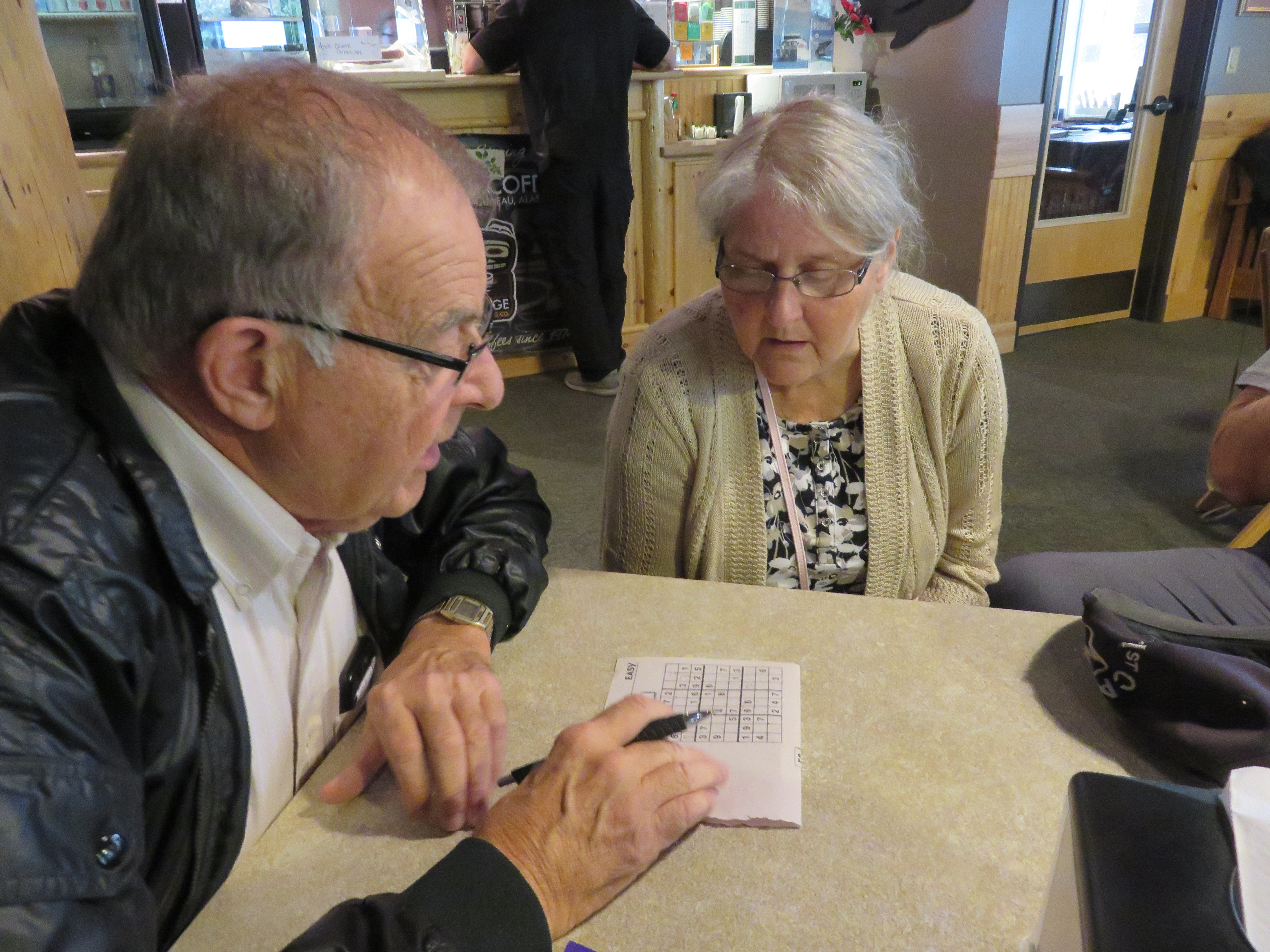 We spent many hours together over the winter and spring planning for the trip with my brother-in-law here, and my sister-in-law. Here they're not trip planning but Barbara was figuring out if she would ever enjoy doing Soduku puzzles. The answer? (What do you see on her face?)