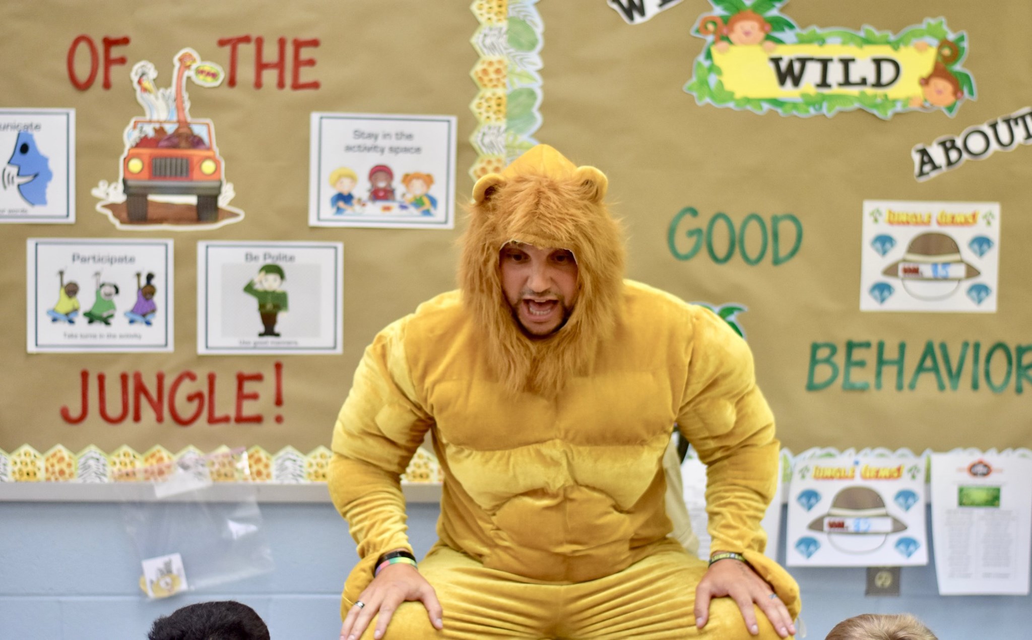 Mr. Scott Showalter on an unbearably hot day when the air conditioning was off, but determined to dress up for the “Lion King” theme!