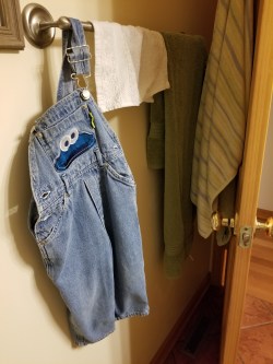 We strip beds, pick up the remaining odd plastic egg or baseball glove, and I spy the Cookie Monster overalls hanging in the guest bathroom. The story there was that three-year-old Henry got a mess of spaghetti on his blue jeans at supper. Since it was just a 24-hour pop-in, they didn’t bring a lot of extra clothes. The house was newly chilly with the first real days of fall, so I pulled out a pair of overalls I keep on hand just in case. The pants were about six inches too short for the lean and lanky almost-four-year-old, but he LOVES Cookie Monster so he happily padded around the rest of the evening in those pants.
