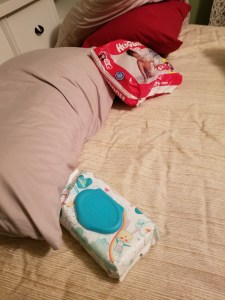 Remnants of diaper changes remain.