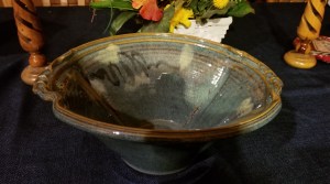 I have been saving, and using only very rarely, a beautiful handmade bowl that was presented to me on one of my work anniversaries—perhaps my 25th? It was a lovely blue-green serving bowl thrown by Dick Lehman, a well-known potter in Goshen, Indiana. Since I, myself, would never buy such a luxury, I do love the bowl. It makes me feel special and somehow wealthy just to admire or use it.