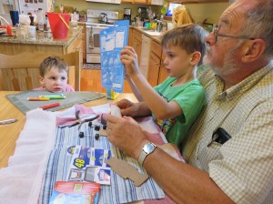 Grandpa and grandsons, “creatively” putting together a wooden racing car (kit).
