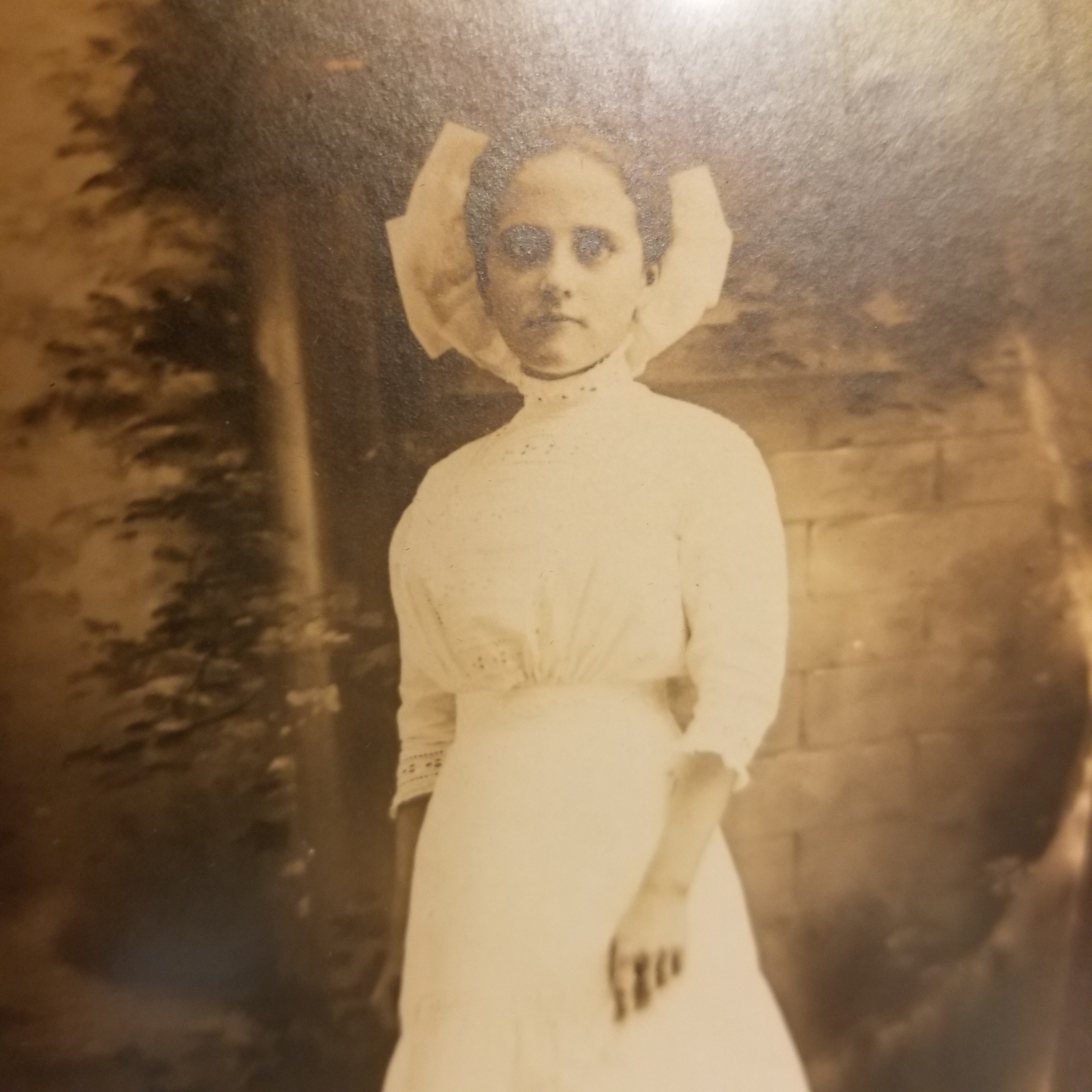 Grandma Ruth Stauffer as a young girl, probably 8th grade graduation. She was allowed to be “fancy” as shown here, before she joined the church.