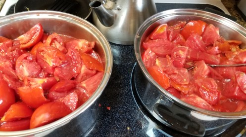 I gather up other items I need for the rather massive and messy project: canning jars, lids, strainer and pestle for squeezing out the tomato juice, scores of large pans or Tupperware, my largest popcorn bowl, salt, a small pot for boiling lids and keeping them hot, digging up the propane fired burner we use outside. Too much to name here.