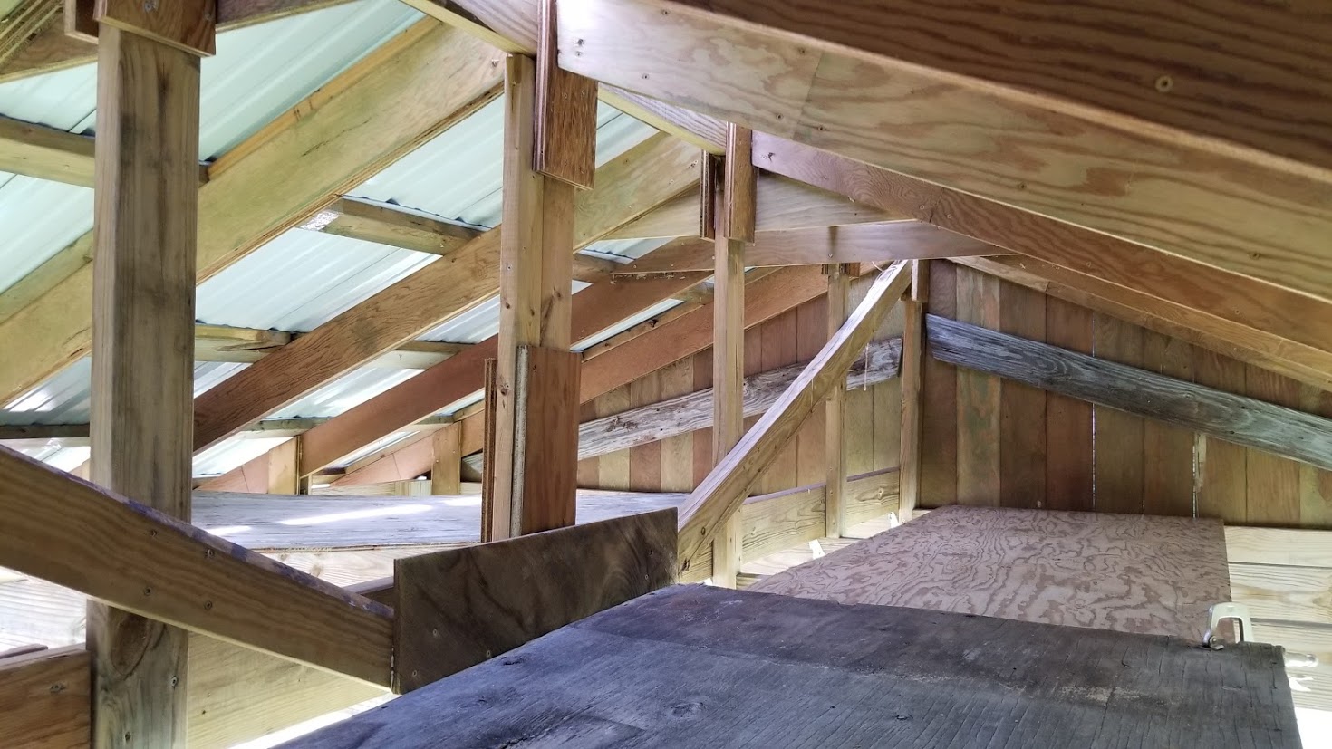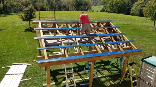 Here you can see the varieties of scrap/free wood we used–and the rafters he glued and screwed together out of the 3/4 inch plywood planks.