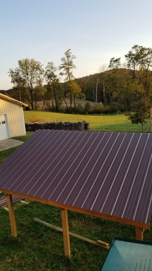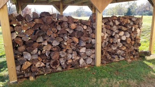 The woodshed looks like a small open-sided picnic pavilion, which is the model he used in his head: no blueprints or sketched out designs. It is 14 by 14 feet with a nice brown metal roof that matches the shed where he keeps (ahem) multiple mowers and tractors. He wanted a woodshed that he could drive wagonloads of wood into with our old heavy-duty lawn and garden tractor, to make it easier to feed the wood stove in our basement. We also have a heat pump we use occasionally, and for when we are too decrepit to saw and carry in wood. In our area, there are lots of wooded areas, so we cut up downed trees in our woods or those of other friends and neighbors.