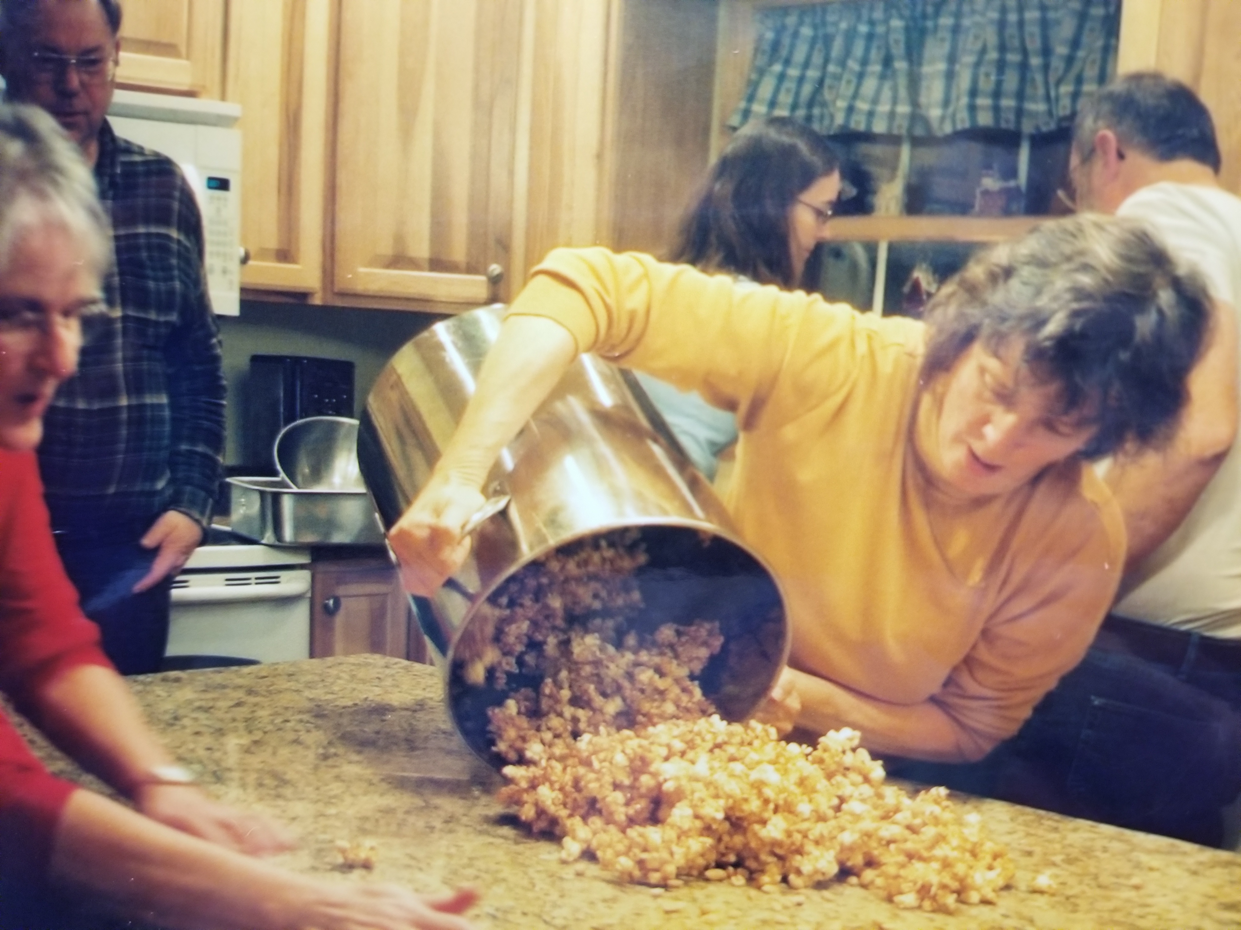 When the syrup mixture is ready, have one person quickly pour all warm popcorn and peanuts into a five-gallon stainless steel kettle on the floor (protecting floor with a clean kitchen rug or towels. The syrup and popcorn are easier to stir together if lowered). One person should pour the hot syrup mixture into the kettle (caution, the syrup can burn bare skin) into the popcorn/peanuts, and another, using a large spoon or long paddle, mix the syrup and popcorn together.
