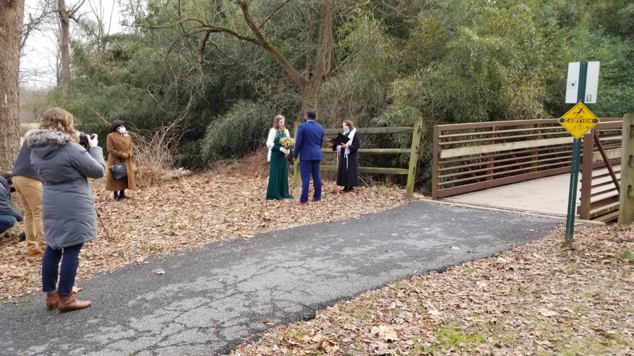 It was a small crowd, just 20, including pastor, photographer/videographer, and immediate family members and their loves. The temperature was hovering near 48 degrees at 3 p.m., start time. Our daughter had picked a small creek and bridge near her church, where we gathered in family bubbles, masked, and at least six feet apart. I was missing the help of my sister-in-law who did the flowers for all our daughters’ weddings, but was not there to take care of pinning on the lovely corsages and boutonnieres she’d made. She had also made a beautiful dried bridal bouquet.
