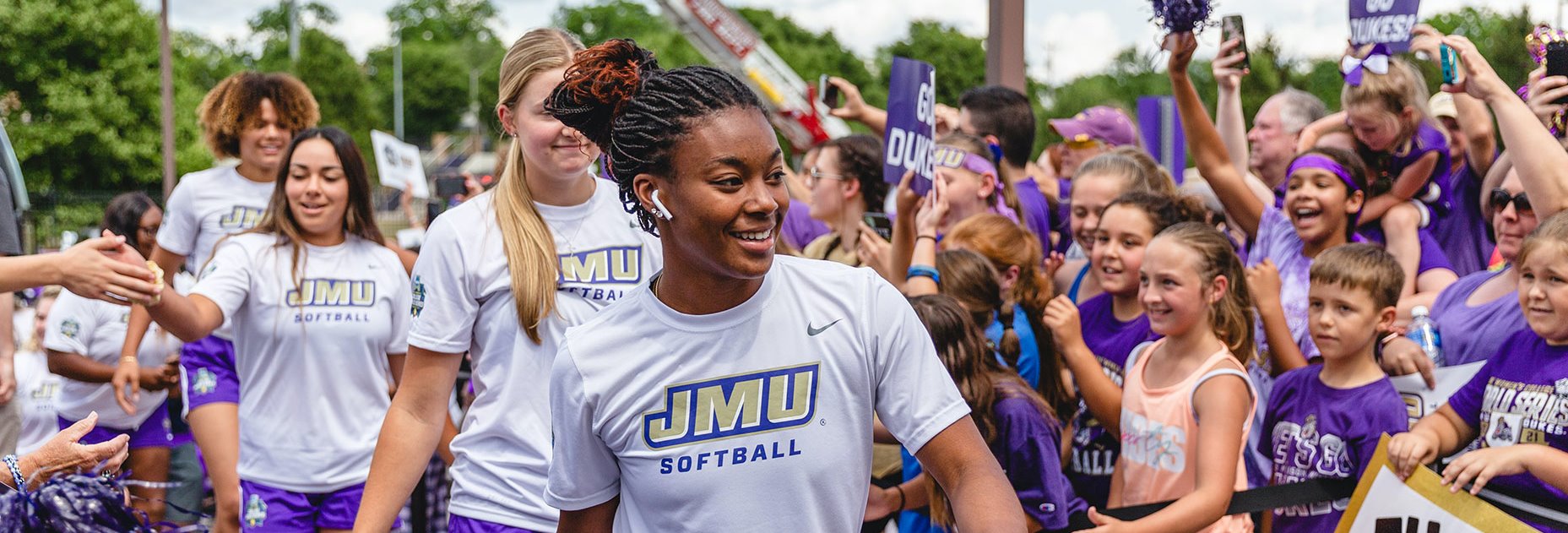 Teammates are greeted when they returned to Harrisonburg after a triumphant effort, including beating the eventual WCWS champion, the Oklahoma University Sooners. Odicci, center, has been invited to play for USSSA Pride professionally. Photo courtesy JMU Sports Information.