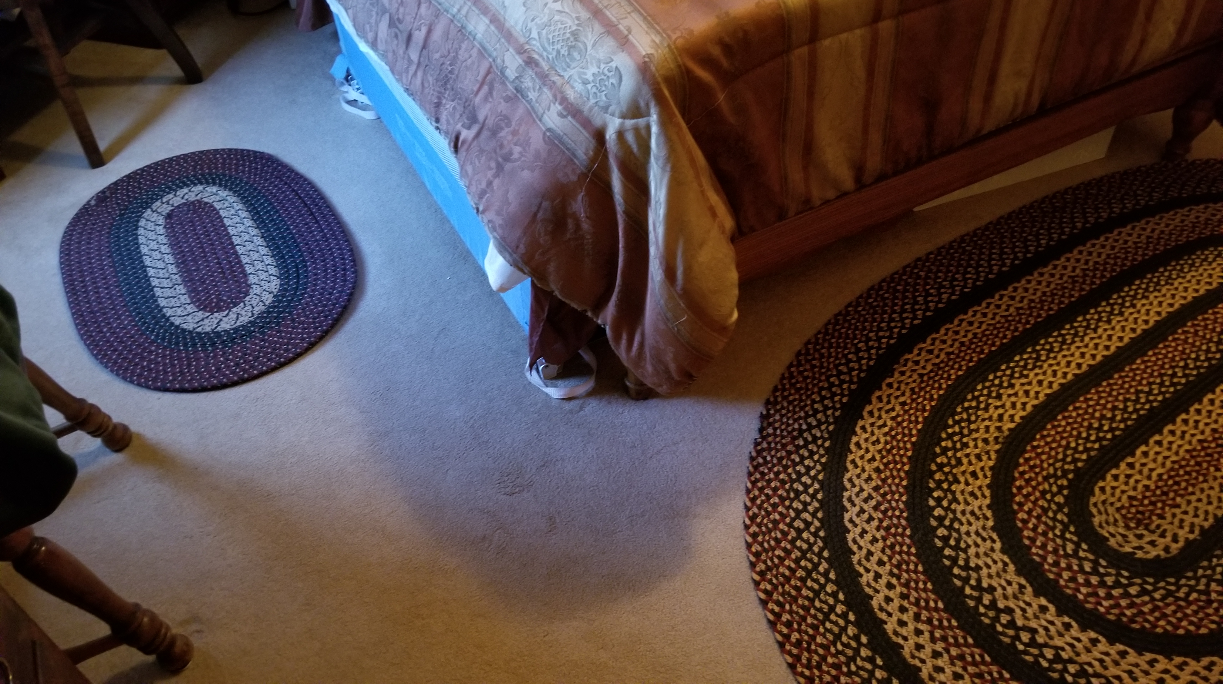 After I helped Edward down, he began further exploring our house and commenting on the many oval braided rugs we have in our house. He went around pointing to them and saying “There’s a zero.” He loves numbers. Next thing I knew, he was picking up the small brown “zero” inside our front door and carrying it back to one bedroom where we had recently put a large brown braided oval rug given to us. Edward planted the small rug near a desk in the room and I loved it: my new interior designer. Totally unexpected.