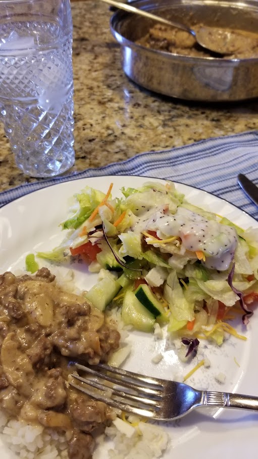 I have always loved Hamburger Stroganoff since first introduced to it when I served one year in Kentucky as volunteer through our church’s service program. The head cook of our household made it with noodles. Later I was introduced to this dish served with rice, which my husband prefers to noodles. So rice it is at our house. I usually use a sauce mix but the packets are consistently hard to find for the last two years in my local Food Lion.