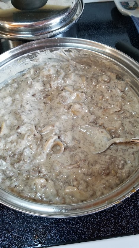 Turn up heat to medium high and using the same skillet, cook the hamburger 5-8 minutes until just brown (no red). Drain off grease. Stir in one cup of the beef broth, Worcestershire sauce, salt, pepper. Bring to boil. Beat flour and remaining ½ cup of beef broth with whisk until smooth-ish; stir that into your beef mixture. Add mushrooms, onions and garlic; heat to boiling, stirring constantly for about 1 minute, until mixture thickens, and flour clumps are gone. Take off of heat and add sour cream and milk.