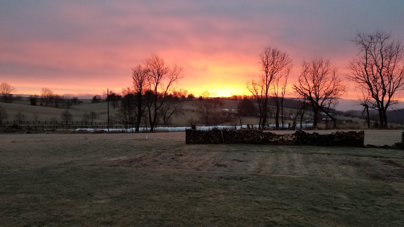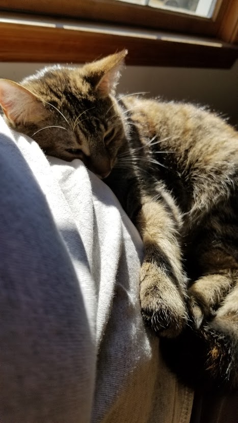 A cat and dog both curling up on my husband’s lap or chair, keeping him warm on a windy night in late March.