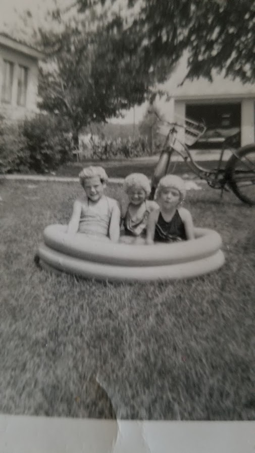 Oldest sis, middle sis, and me looking just dreadful. Our pool before we had the pond enlarged for swimming. I think.