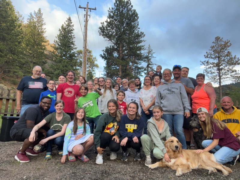 When we finally got to our first four-day destination in Estes Park, in the Rocky Mountains of Colorado, it was supper time. We were hungry, but I knew we needed to buy a few groceries for the first couple days at the cabin we’d rented with one of our daughters and her husband (front row, left). I’d brought lots of staples but we needed some fresh things.