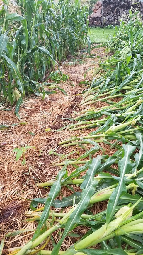 Then came a sharp fierce wind and rain that felled three rows of sweet corn. Would they recover? Time would tell.