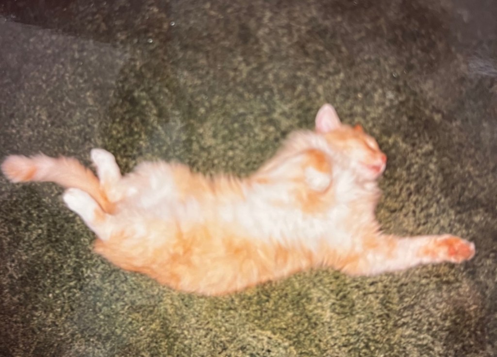 Doreen’s favorite cat came much later when she was living with us after college and working at a bank. A friend of hers knew of an orphaned kitten that Doreen brought home and fed from a dropper. Doreen named her Paisley. When Doreen moved to another state to pursue a master’s degree, Paisley claimed my husband as her favorite, and loved riding around on his shoulder.