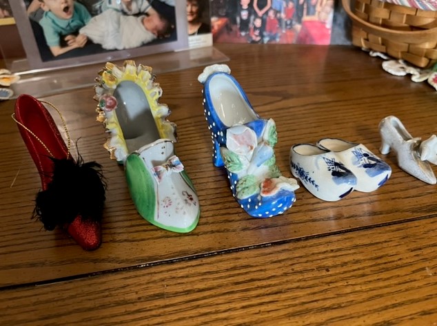 Mom also let us play with trinkets—such as a collection of high heeled miniature shoes that she always bought when we traveled (if she could find the little shoes in souvenir shops). Each of us as daughters and granddaughters now have a glass shoe or two from her collection. She herself was unable to wear spiky high heeled shoes, because her size 10 feet were “so hard to shop for.” In her older years we took her shoe shopping, which was quite an ordeal finding shoes that fit and that she liked.