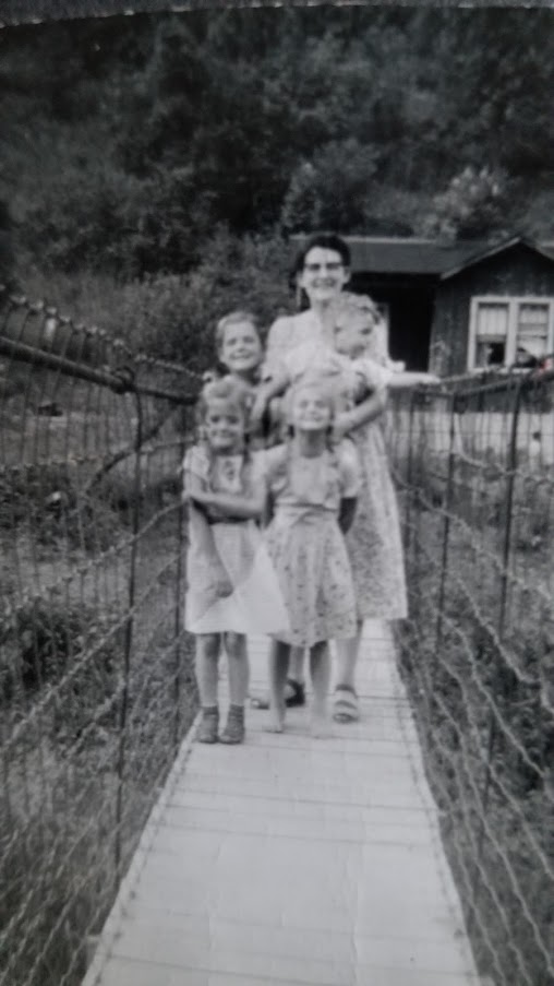 Our family on a swinging bridge in Kentucky many years ago. Mom and Dad helped a small church when the pastor needed a vacation.