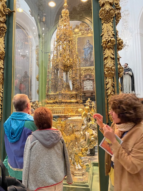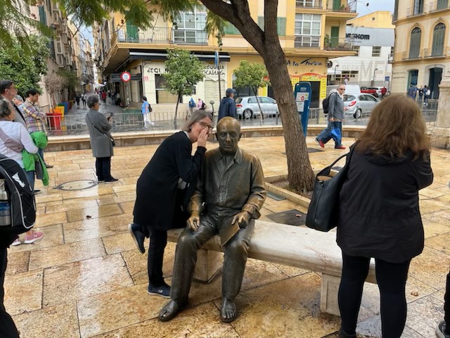 A more serious altercation took place another day on a lovely, fairly large plaza where we had sat down on some park benches to enjoy some ice cream. A Spanish artist (at least he looked like he was likely Spanish) was engaging in some painting on the plaza, the better to illustrate to passersby his excellent work and perhaps propel someone to pause and get a painting made. Then another artist of a different kind—musical—claimed part of the plaza space and began to serenade us with delightful Spanish guitar music. However, it looked like the painting artist was not a bit happy and looked threateningly at the guitarist who appeared to be just wanting a space to practice his art as well—(and collect euros in his guitar case). Then things got lively—the painter taking a whop at the guitarist with a board which actually broke the guitar. The guitarist got out of the way and we kept watching if he was going to call some police, which he did and finally one arrived to handle the dispute. We didn’t hang around much longer, and the artist drove away on his bicycle toting his bag, supplies, and backpack. I was not taking pictures, of course!!