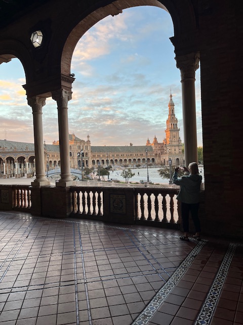 Early morning (8:45) Plaza de Espana in Seville, originally built for Seville’s Ibero-American Expo for the 1929 World’s Fair. The 540,000 square foot plaza features a sprawling mosaic patio. The woman on the right was in our group, with her siblings and spouses, a total of 6 family members.