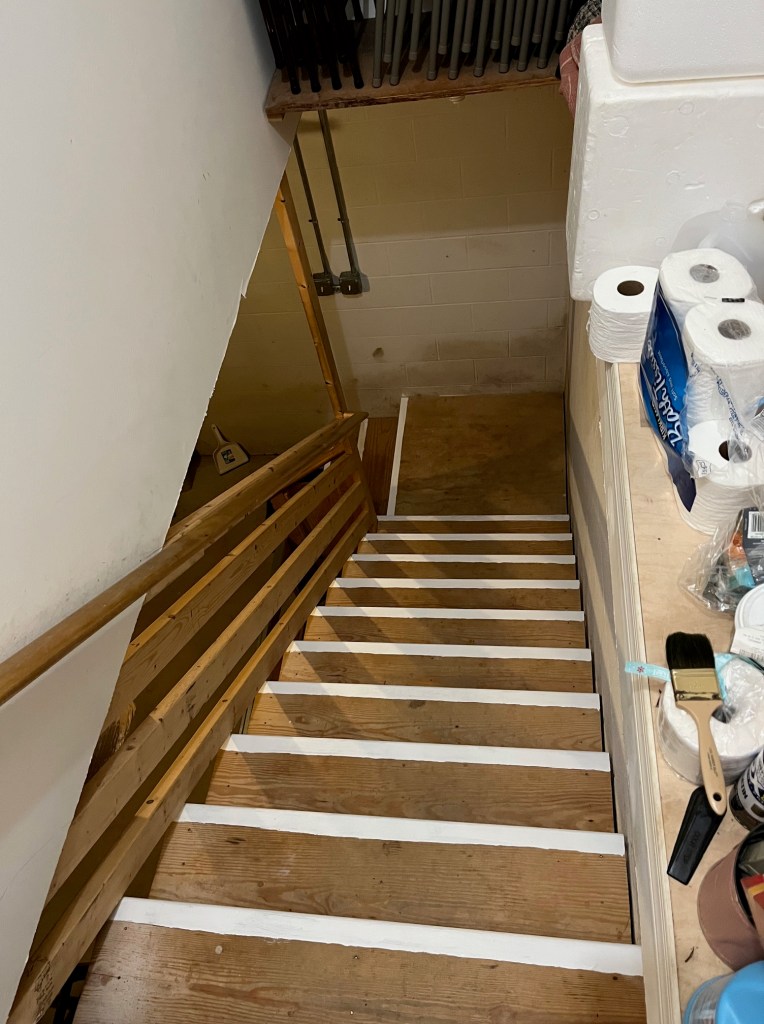 But there was a step toward the bottom which always challenged me, if, again, it was darkish outside and I hadn’t yet reached the light switch to light the way. My husband suggested we add white paint strips to the rest of the steps. Today I painted strips on those steps too, and I’m oh so happy. I hope it is at least 50% better than the steps were, and I hope both the young and the old will pay attention and not skip or fall on those steps.